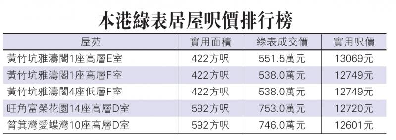 【大公報訊】記者林惠芳報道:未補地價的綠表居屋升勢急勁,有居屋王之稱的黃竹坑雅濤閣,兩房戶未補地價賣551.5萬元,呎價達13069元,為全港綠表居屋首破1.3萬元呎,蟬聯居屋王寶座。