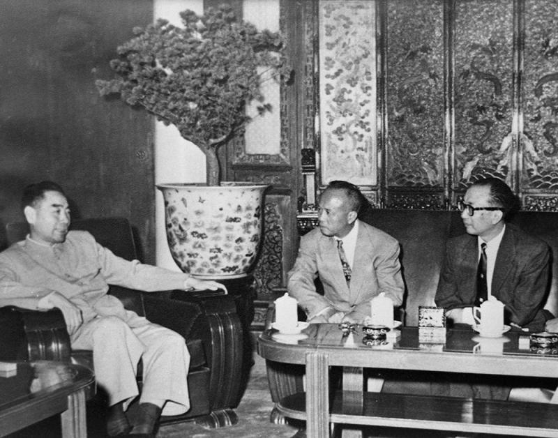 圖:1956年周恩來在北京會見大公報社長費彝民(右)及中華總商會會長許庇穀(中)