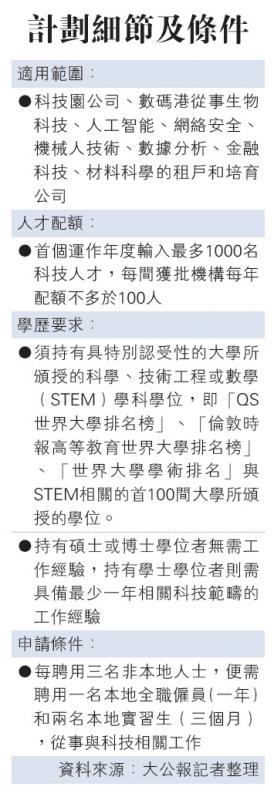 【大公報訊】科技人才計劃會率先在數碼港及科學園內試行。初創公司TravelFlan創辦人之一龐維銘指,目前公司的員工有70人,卻只有20人組成的技術小組,不足以將公司的影響力伸展到內地,故歡迎引入外地專才到港發展。數碼港創業經理蘇雅麗稱,政府透過輸入外地人才滿足本地對科研人才的要求,「的確可以解決燃眉之急」,並相信優秀的人才會令香港某些產業的發展步伐加快。