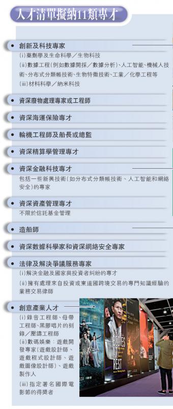 香港經濟未來朝高增值行業發展,但個別專業長期缺乏人才。政府醞釀三年即將推出「人才清單」,建議羅致全球包括創科、金融、法律、航運、娛樂、環保等11類專才(詳見表),透過現行入境處「優秀人才入境計劃」輸入本港。政府強調,清單不會削弱本地人才的培訓及就業機會。但有相關業界人士指引入人才之餘,政府亦要培育相關產業,質疑「無工開」如何留住人才;亦有認為政府需設法吸引更多大企業落戶香港,營造合適市場及生活環境,才能吸引專才。\大公報記者 陳卓康 楊州