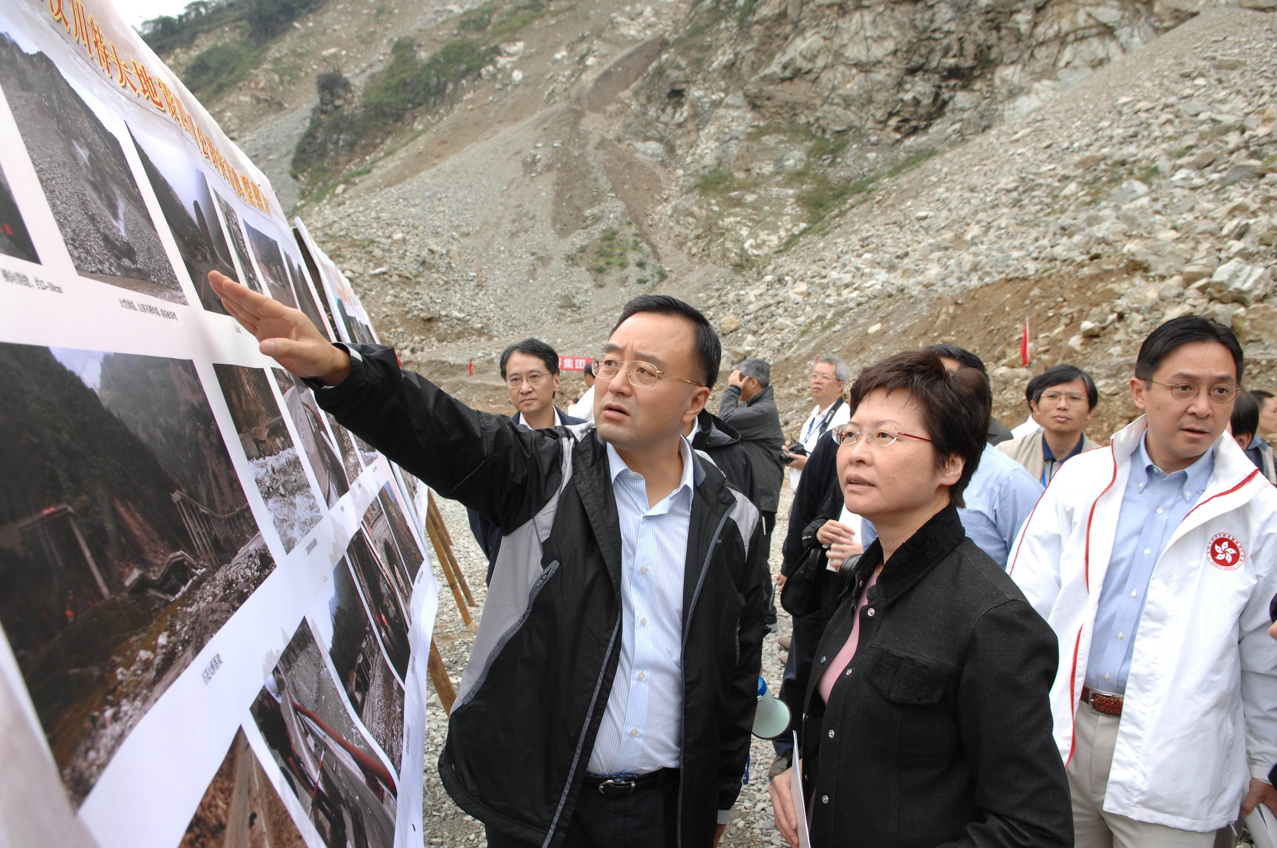 林郑月娥率团访川,将出席汶川地震10周年纪念等活动。图为2008年10月11日,时任特区政府发展局局长的林郑月娥视察省道303线映秀至卧龙段公路重建工程。(资料图片)