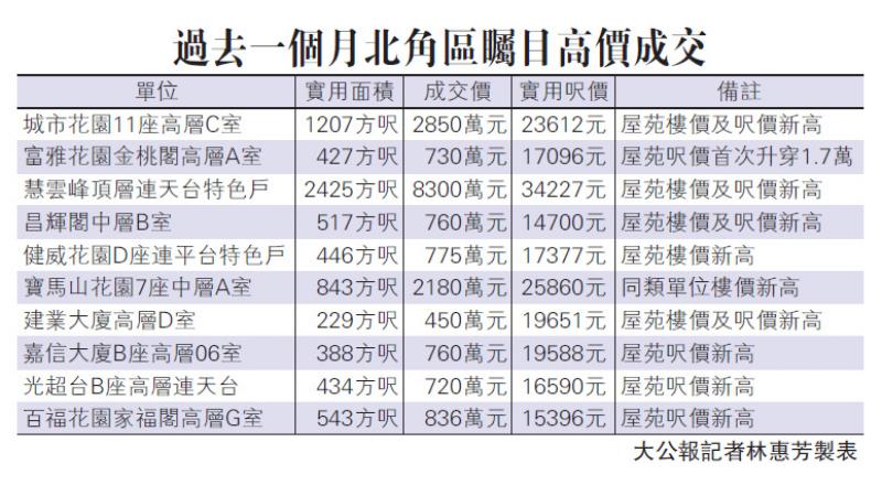 新盤成為二手住宅催化劑,受新地(00016)北角海璇樓價造好刺激,加上同區新世界(00017)柏蔚山蓄勢待發,推動同區二手爆升,過去一個月最少錄15宗高價成交,其中城市花園一伙銀主盤反價100萬元,以2850萬元沽出,呎價2.36萬元,樓價及呎價俱創歷史新高。代理透露,目前北角最少有兩成業主封盤,靜待柏蔚山開價。\大公報記者 林惠芳