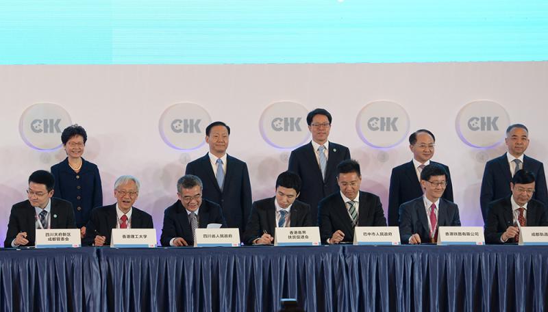 圖:四川省委書記彭清華,香港特區行政長官林鄭月娥,國務院港澳辦主任張曉明及中聯辦主任王志民見證簽字儀式/大公文匯全媒體記者麥釣傑攝