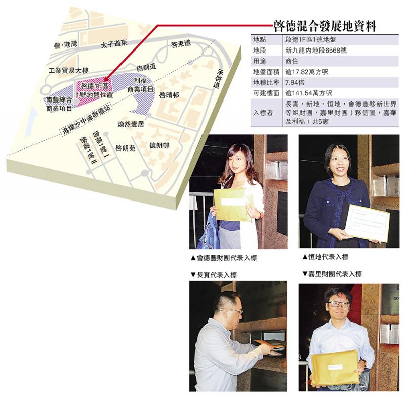 而在入標現場所見及暫已所得知的消息,去年叱吒賣地場上的內房,繼早前港鐵油塘通風樓項目後,今次還未見有出擊意圖。五家入標財團,包括本港前三大發展商長實(01113)、新地(00016)及恆地(00012),均獨資入標。嘉里建設(00683)則夥信置(00083)、嘉華國際(00173)及利福國際(01212)合作爭標;會德豐(00020)及新世界(00017)牽頭財團,在在皆是本港最有實力的發展商。