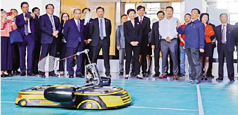 圖:聽取團隊負責人駱德淵介紹羽毛球機器人的「往績」,林鄭月娥不時發問,並對團隊的創新表示讚許