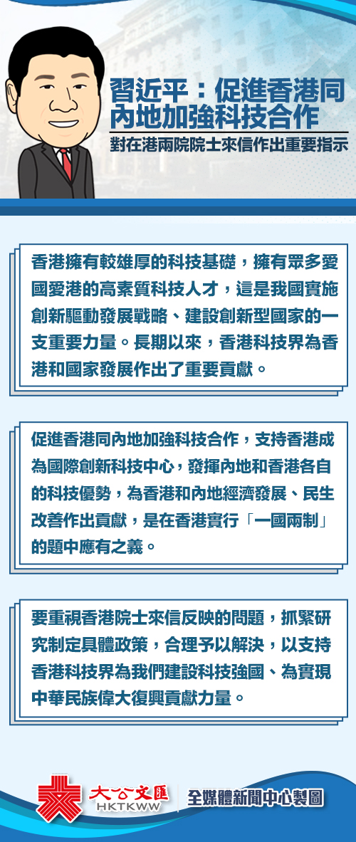 習近平指出,香港擁有較雄厚的科技基礎及眾多愛國愛港的高素質科技人才,是國家實施創新驅動發展戰略、建設創新型國家的重要力量;促進香港同內地加強科技合作,支持香港成為國際創新科技中心,為兩地經濟發展、民生改善作出貢獻,是「一國兩制」的題中應有之義。