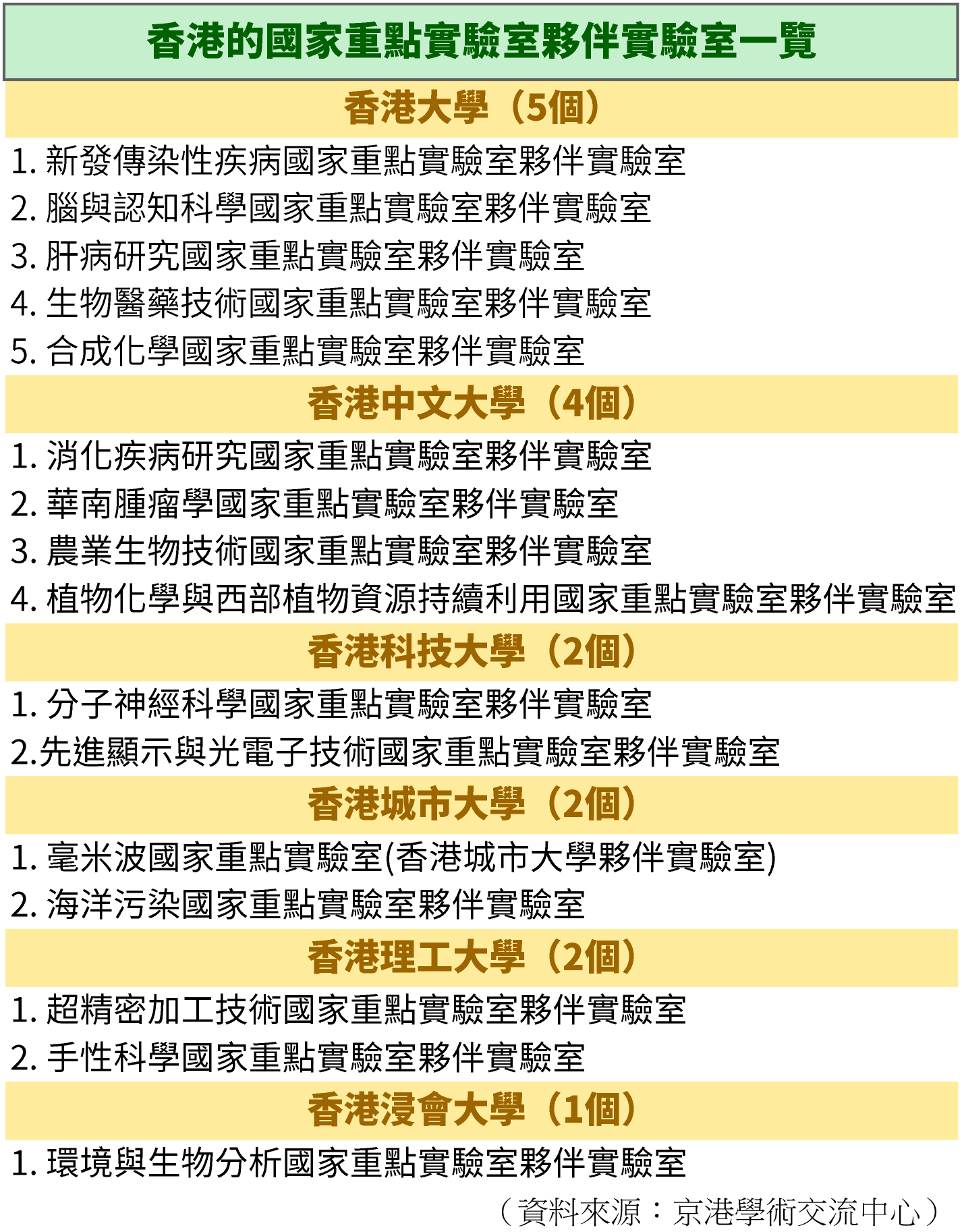 香港的國家重點實驗室夥伴實驗室一覽