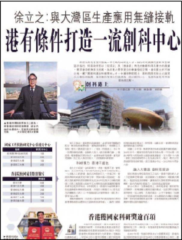 【大公報訊】本報獨家訪問港科院院長徐立之對香港有條件成為一流創科中心的報道(右圖)備受關注。原來,他是去年六月致函國家主席習近平的廿四位聯署人之一。對於國家主席習近平親自批示跟進有關事項,他認為對本港科學界無疑是一支強心針,有助促進兩地科技合作。