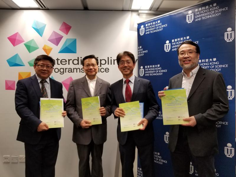圖:中國工程院、香港工程科學院及香港科技大學公共政策研究院共同發表首份有關粵港澳大灣區創新科技整合發展的報告。左起為吳遜、張炳良、李行偉及周敬流 /大公報記者楊州攝