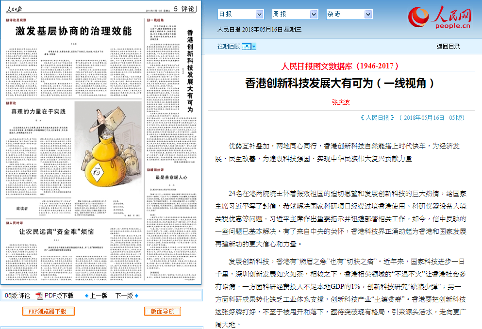 人民日報刊登文章指香港發展創科大有可為(網絡截圖)