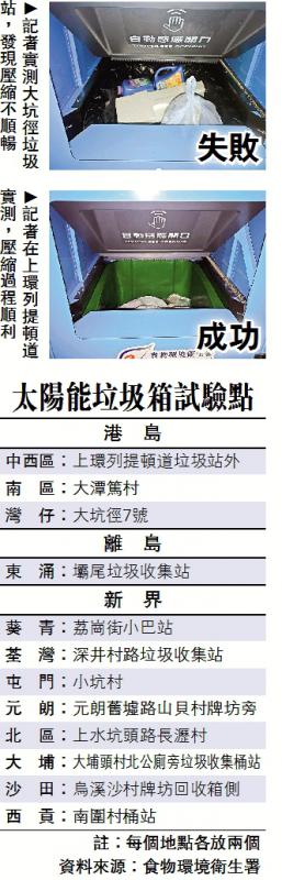 食環署斥資69萬元,在偏遠鄉郊垃圾站放置24個太陽能垃圾壓縮箱,平均每個2.9萬元,聲稱垃圾桶內每七分鐘掃描一次,當感應到垃圾量已達七成滿,便自動開啟壓縮功能。但大公報記者昨日實測發現,效能不穩,在西貢南圍和港島大坑徑的壓縮箱,當垃圾放滿七成,記者等了逾10分鐘,再打開門發現,箱內垃圾袋和發泡膠完好無缺,無被壓扁;在上環列堤頓道的兩個壓縮箱,則於放滿幾分鐘後開始壓縮,騰空了約四分一的容量。