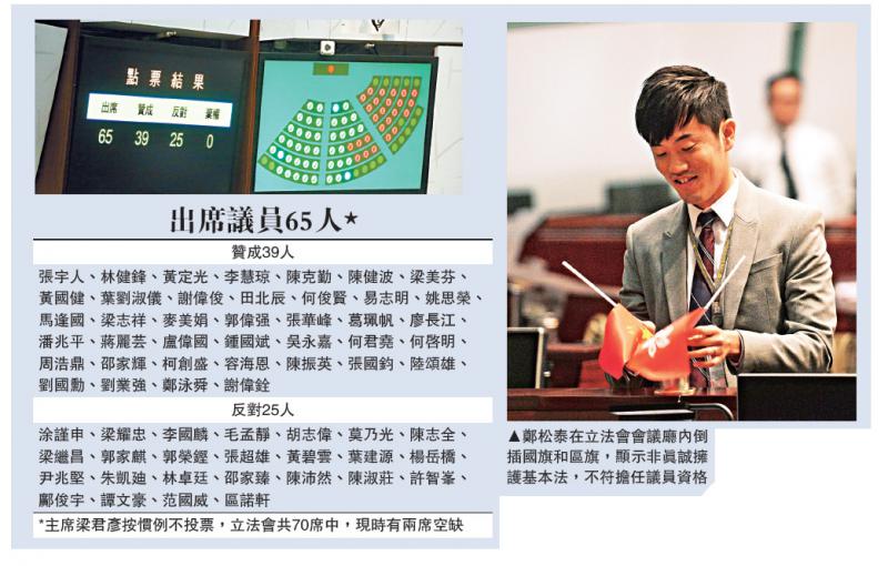 在反對派全力包庇之下,立法會譴責鄭松泰倒插國旗和區旗的動議,昨日獲得39票贊成、25票反對,未能達到三分之二議員支持、方可通過的門檻,鄭松泰僥幸逃過DQ。建制派議員在會上狠批,鄭松泰的行為是刻意否決國家和特區,顯示其並非真誠擁護基本法、效忠香港特區,不符擔任議員的資格,而且他在法庭裁定罪成的情況下,依然找藉口開脫,反映他根本毫無悔意。/大公報記者 莊恭誠