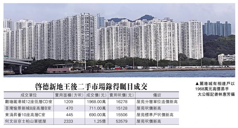 啟德地王誕生,令樓市火上加油,繼鰂魚涌太古城誕下「半億」樓王後,與地王同屬九龍東的觀塘麗港城亦爆癲價,一伙相連戶以近2000萬元賣出,刷新屋苑分層戶最貴紀錄。/大公報記者 林惠芳
