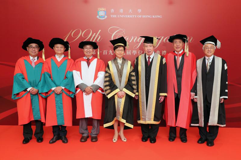 圖:港大舉辦第199屆學位頒授典禮,身兼港大校監的行政長官林鄭月娥(中),分別向蒙德揚(左一)、馬雲(左二)及鄧青雲(左三)頒授名譽科學博士及名譽社會科學博士學位\港大圖片