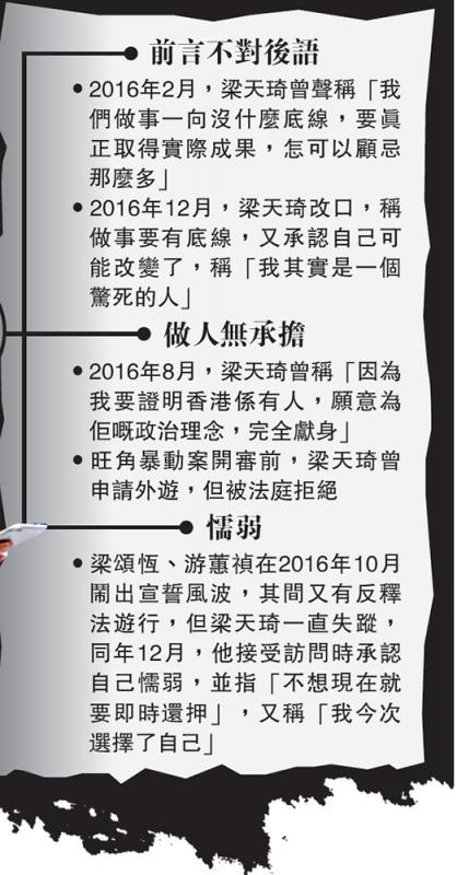 梁天琦在旺角暴動案之中,暴動罪名成立。一眾亂港派立即出來大合唱,惺惺作態稱要向其「致敬」,顛倒是非,塑造所謂的「抗爭英雄」形象。代表案中第四被告林傲軒的辯方律師游月華,昨日則在facebook分享所謂與梁天琦的點滴,透露梁曾反覆問她,是否不應該返回香港,然後梁又聲稱應該回來,「要返嚟找數」雲雲。對於如此有「承擔」的言行,記者翻查資料,發現在同案黃台仰李東昇去年底棄保潛逃後,梁天琦曾於開審前申請外遊被拒,外遊意圖明顯,出庭應訊應是「着草」不成的結果,而非什麼「有承擔」。」大公報記者 冼國強