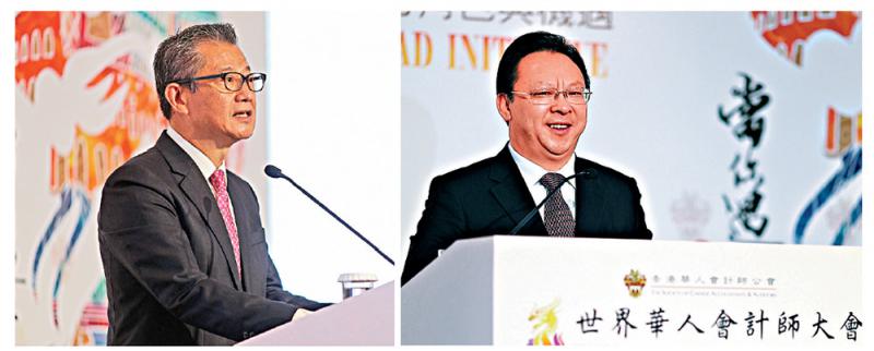 圖:財政司司長陳茂波(左圖)、中聯辦副主任譚鐵牛(右圖)在世界華人會計師大會上先後致辭
