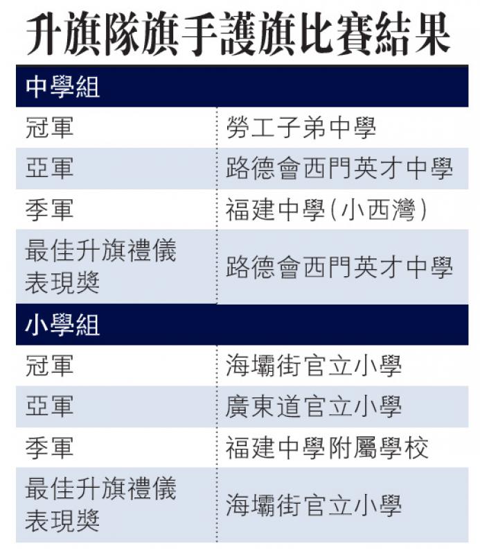 【大公報訊】香港升旗隊總會昨天舉行一年一度的「升旗隊旗手護旗比賽」,勞工子弟中學和海壩街官立小學分別獲得中學和小學組冠軍。海壩街官小同時獲得「最佳升旗禮儀表現獎」。