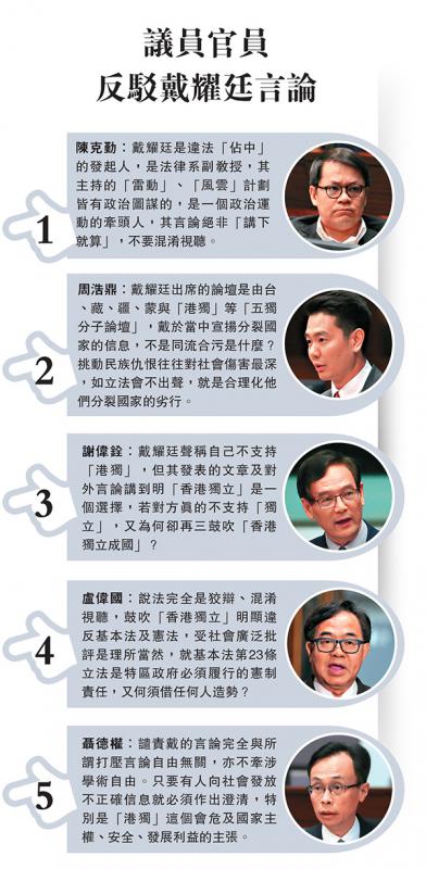 立法會休會辯論通過有關港大法律學院副教授戴耀廷在台灣發表涉嫌鼓吹「港獨」言論的議案。一直是戴耀廷「信徒」,自稱為「佔中十死士」之一的社福界議員邵家臻於會上代戴耀廷讀稿,戴聲稱政府打壓一名無任何公職的小市民,是要為23條立法鋪路及重劃言論自由的政治紅線。政制及內地事務局局長聶德權表明,政府絕不能接受和容忍有人利用言論自由鑽空子鼓動「港獨」。提出休會待續議案的民建聯立法會議員陳克勤指出,戴耀廷主持的「雷動」、「風雲」計劃皆有政治圖謀,是一個政治運動的牽頭人,其言論絕非「講下就算」,故立法會必須要表態。\大公報記者 龔學鳴