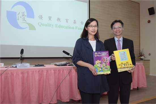 香港「公帑資助學校專項撥款計劃」及2018-2019年度的11個優先主題的傳媒簡報會上,展示不同的學校通過優質教育基金的支持而設計的課本