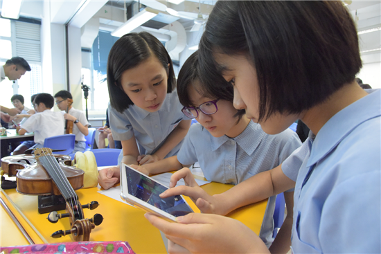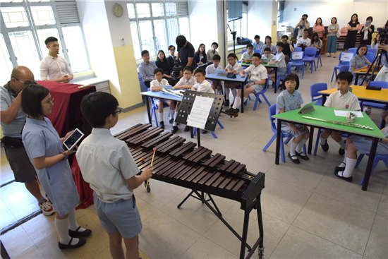 學生在課堂用平板電腦進行音樂創作,並結合樂器演奏創作的音樂,分享創作的成果