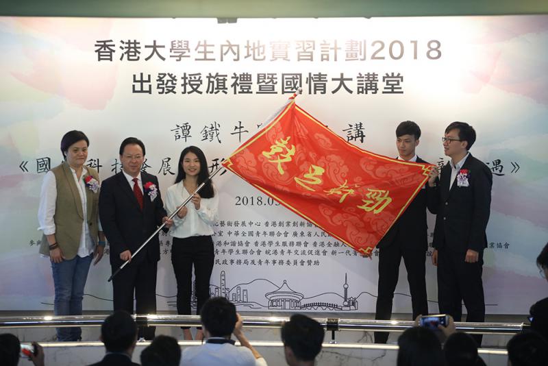 由香港文化藝術發展中心主辦的「香港大學生內地實習計劃2018」,昨日舉行出發授旗禮,約500名參與計劃的學生出席,並邀請中聯辦副主任譚鐵牛擔任主禮嘉賓。香港文化藝術發展中心執行董事王耀瑩致辭時稱,不少實習回來的學生都對內地的科技發展表示讚嘆,部分人更習慣了內地的便捷生活,回到香港反而不適應。他希望學生在機構學習之餘,同時思考自己在國家發展大局中可以擔當什麼角色。