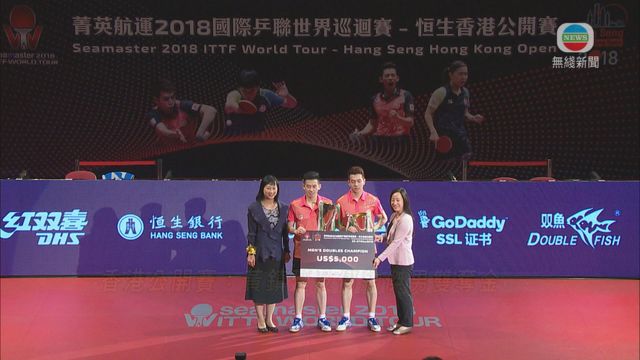 27日,2018國際乒聯世界巡迴賽香港公開賽,港隊組合黃鎮廷(左二)、何鈞傑(左三)奪男雙冠軍(視頻截圖)