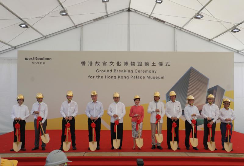 在西九文化區的故宮館昨日舉行動土儀式,林鄭月娥、故宮博物院院長單霽翔、國家文物局副局長劉曙光、唐英年、陳智思、香港賽馬會主席葉錫安等主禮。