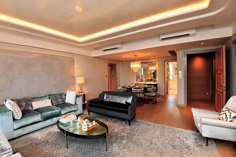 偌大的長方形客飯廳布局分明,減少走廊位置,方便擺放傢具;客廳配置法式玻璃摺門,並連接圓角露台,空間感及採光度高。客飯廳以柔和素色作主調,牆身採用「Marmorino」技術,運用塗料營造不同層次的大理石效果;客廳擺放購自巴黎的灰藍色系梳化,配以同色系地毯,突顯法式優雅。