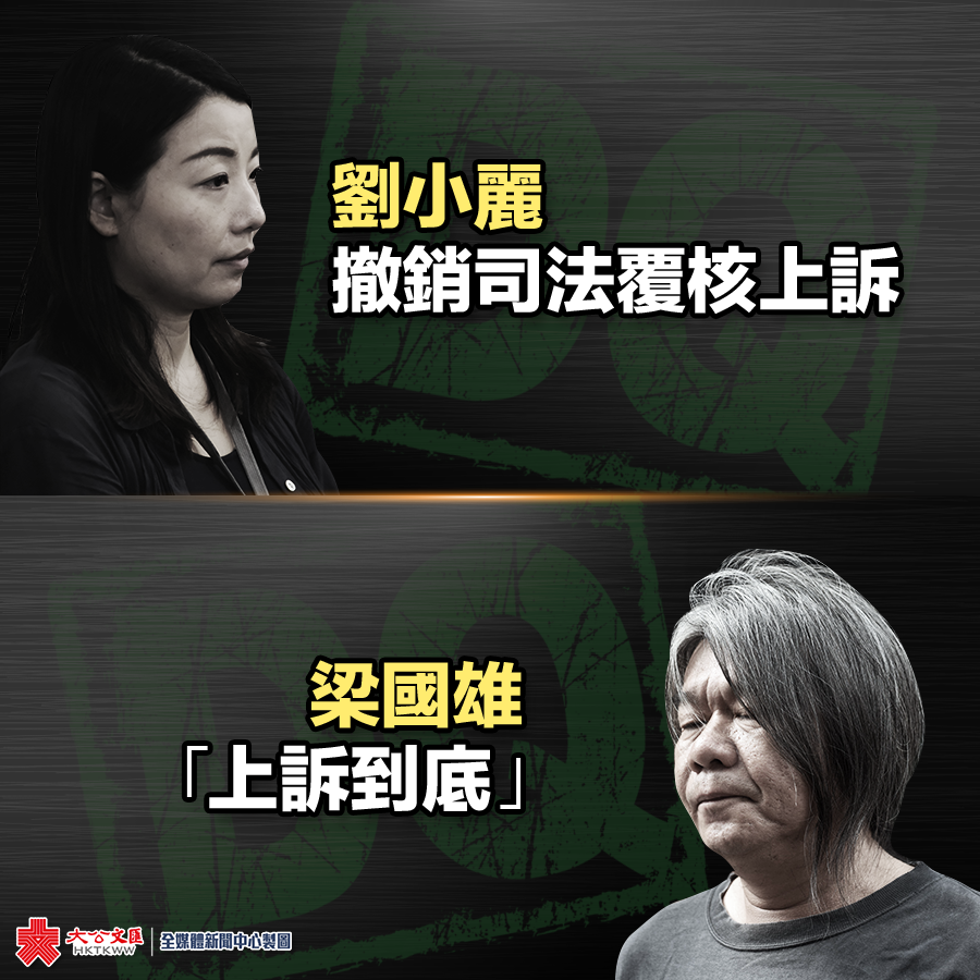 大公文匯全媒體報道:因違法亂誓被取消香港立法會議員資格的劉小麗今日(29日)表示,將放棄就議席問題上訴。劉小麗稱,據她了解她的案件可能要排到11月才審理,亦有機會是明年4月或更後的時間;又指變數好大,因此認為撤回上訴是較審慎和明智。同被取消議員資格的社民連梁國雄則繼續死撐,表示要上訴到底。