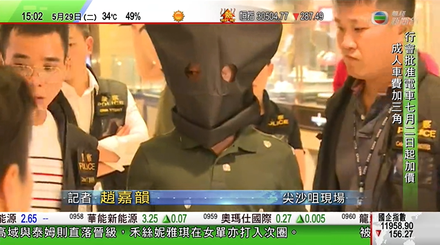 疑犯黑布蒙頭及戴上手銬,被帶到案發珠寶店描述事件經過(電視截圖)