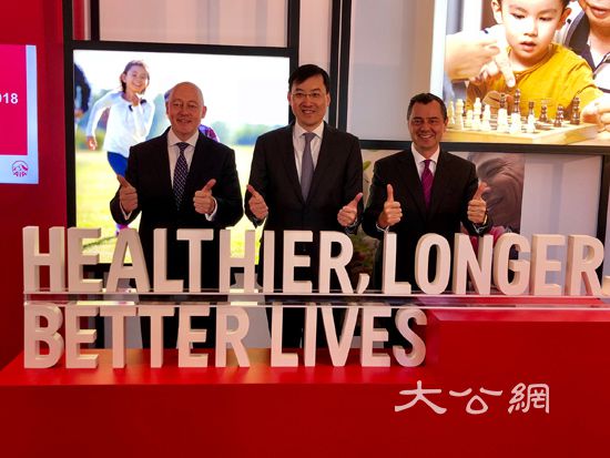 (左起) 友邦香港及澳門首席執行官顧培德、友邦保險集團區域首席執行官陳榮聲及友邦保險集團首席市場總監施斌陞。(大公報記者邵淑芬攝)