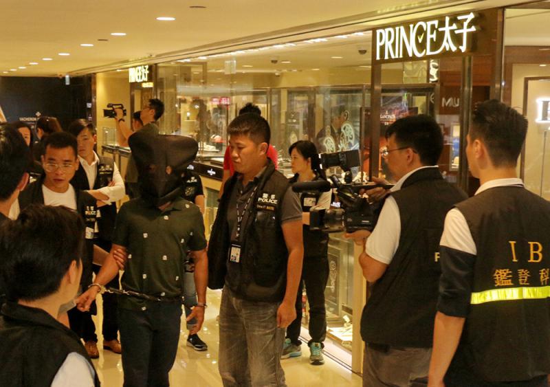 海港城太子珠寶鐘表上周三晚五百萬元巨劫案,不足一星期偵破。警方重案組憑「天眼」片段及八達通紀錄,拘捕一對兄弟,並在其中一人的行李袋內起回全數贓物。消息指,被捕的兄長為上世紀80至90年代轟動全港的械劫集團首腦何東成。據悉,何東成曾涉及開槍行劫、謀殺等重罪,他1993年落網後被判17次終身監禁,其後覆核刑期改判20年,他最近才出獄。警方正追捕案中另一名持刀劫匪。/大公報記者 周慶邦(文/圖)