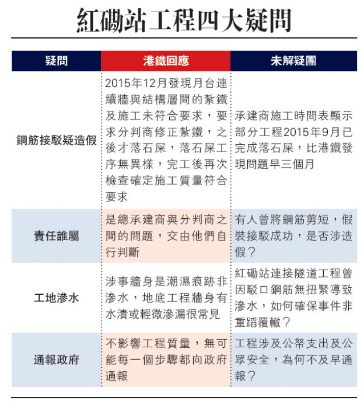 港鐵近期接連因被傳媒揭發問題,而需匆忙解畫,先有高鐵試營運期間爆出車輪偏離路軌、隧道滲水、車站天花漏水及車輪嚴重磨蝕等問題,再來就是紅磡站的擴建工程。情況或不盡相同,但港鐵每次都是「先被踢爆再解畫」,再加上「我哋話畀你聽OK就得㗎喇」、「我哋無可能每一個步驟都向政府通報」之類的回應,實在令公眾難以接受,或許一般市民無法理解複雜的工程問題,但公眾關心涉及龐大公帑支出、影響公眾安全的鐵路項目是理所當然,港鐵何解就不能提升工程透明度、主動公布公眾關注的問題事項?