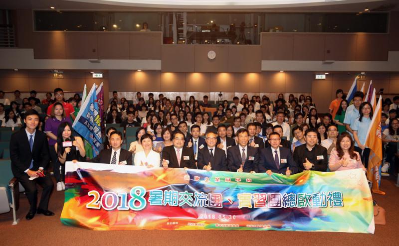 「2018暑假交流團、實習團總啟動禮」昨日舉行,民政事務局局長劉江華,全國政協委員、香港大公文匯傳媒集團董事長、未來之星同學會主席團主席姜在忠,中聯辦青年工作部副部長楊成偉,青年發展委員會委員徐小龍,中道集團董事長、未來之星同學會榮譽主席莊紫祥,以及雲鋒金融集團首席執行官李婷等擔任主禮嘉賓,約200名大專生到場參與。