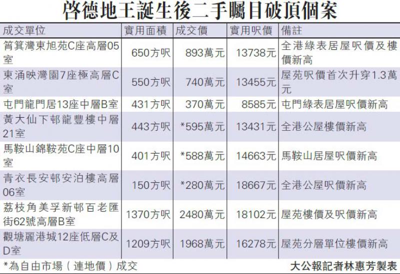 據大公報統計,啟德新地王令樓市火上加油,九龍區二手樓價明顯爆升。十大指標屋苑之中,九龍區屋苑本月均價全線升至歷史新高,紅磡黃埔花園平均呎價首度衝破1.7萬元大關,按月漲2.4%,今年累計升幅11.1%,目前細兩房單位叫價已高見「八球」。」大公報記者 林惠芳