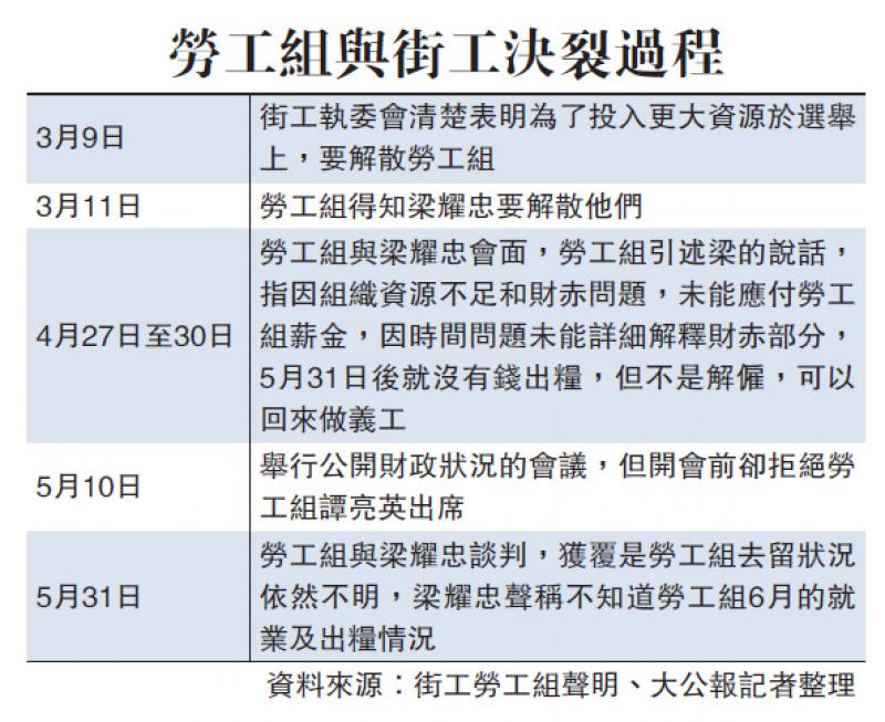 街工轄下的勞工組共有三名僱員,包括譚亮英、黎治甫及王曉君。他們於五月一日出席五一勞動節遊行時,批評梁耀忠「不是解僱」、「唔出糧唔等於遣散,你哋鍾意可以返嚟做義工」等講法,認為有關講法不能接受,形容做法等同「無良僱主」,不尊重僱員權益。