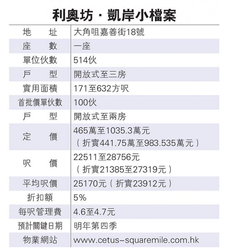 新盤趁樓市「㷫烚烚」加速搶攻。繼大埔嘉熙及北角柏蔚山後,恆地(00012)旺角利奧坊.凱岸接力出擊,首批103伙折實平均呎價23912元,貼近同區二手,較同系利奧坊.曉岸兩年半前首批賣貴43%。至於最細193方呎開放式折實近442萬元入場,平絕全港,而500萬元有找的單位共28伙。項目最快下周發售,周日收票。\大公報記者 梁穎賢