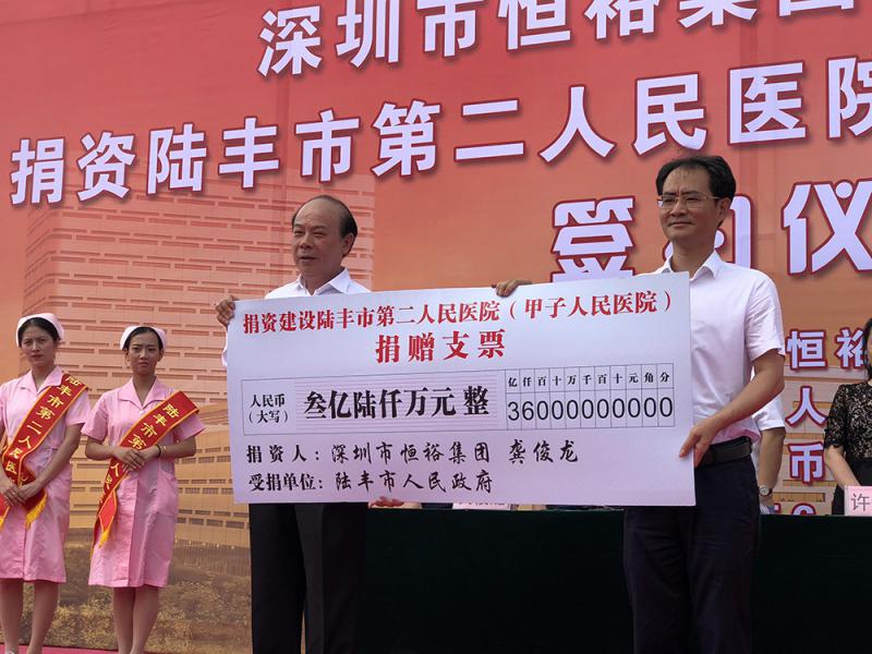 由全國政協委員、香港廣東社團總會執行主席龔俊龍捐資3.6億元人民幣興建的陸豐市第二人民醫院(甲子人民醫院),昨日舉行捐資簽約儀式。龔俊龍在儀式上說,自己作為甲子人,每當聽到、看到三甲地區的鄉親因醫療設施有限,而不得不輾轉奔波到外地看病,甚至「因病致貧」,自己不免感到心痛,加上習近平總書記提出要「幫助革命老區困難群眾實施精準扶貧、脫貧」,因此決定無償捐建,希望為鄉親的健康福祉出一分力。\大公報記者 莊恭誠
