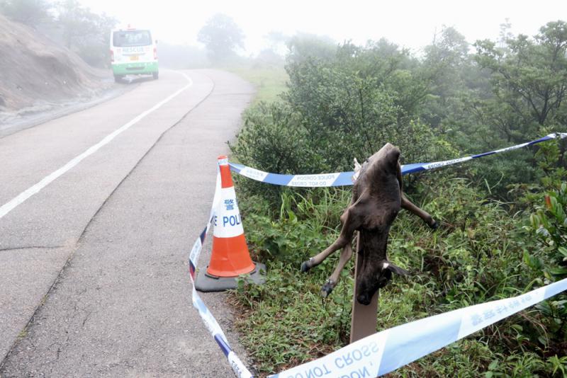 大帽山驚現恐怖小牛屍掛柱!一名疑似南亞裔壯男昨晨在山頂雷達站的車道,拖着一幅牛皮,目擊者即報警;警員到場發現一幅僅餘頭部及四肢的「小牛皮」,內臟與骨被掏空,掛在路邊標距柱上,壯男卻不知所終,警方暫將案件列作「殘酷對待動物」案處理。現場消息稱,掛牛皮現場未有發現宰牛痕跡或小牛的內臟,警方不排除宰牛者不止一人,並且有交通工具接應。\大公報記者 周慶邦 (文、圖)
