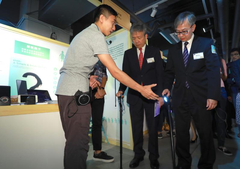 圖:張仁良(中)試用專門為長者設計的多功能智能枴杖