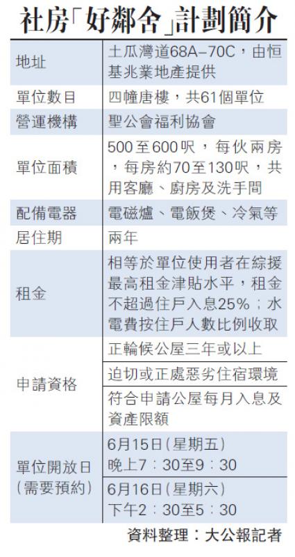 社會共享房屋項目「好鄰舍」由恆基兆業提供61個單位,位於土瓜灣道68A至70C四幢八層唐樓,單位一廳兩房,會編排兩個家庭入住,共用廚廁,料有122個有需要家庭入住,是「社會房屋共享計劃」開辦以來規模最大和單位最多的項目。截至六月,聖公會共收到60多份申請,現時批出約一半申請,經社工配對後,陸續有20個單位出租。