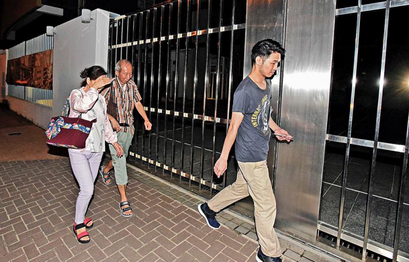 圖:被困學校內電梯至凌晨始獲救的爸爸在親友陪同下離開