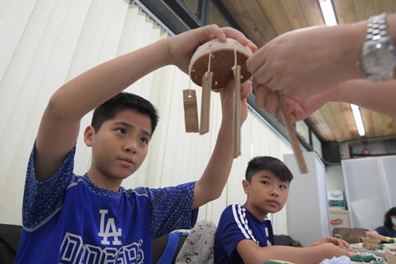 圖:工作坊參加者袁弘臻(左)認為用竹枝製作風鈴,不但可重用物資,也有助減輕堆填區負荷