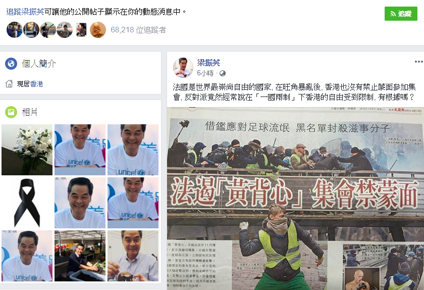 梁振英在帖文中,引用《文匯報》今日一篇題為〈法遏「黃背心」集會禁蒙面〉報道,指:「法國是世界最崇尚自由的國家,在旺角暴亂後,香港也沒有禁止蒙面參加集會,反對派竟然經常說在『一國兩制』下香港的自由受到限制,有根據嗎?」