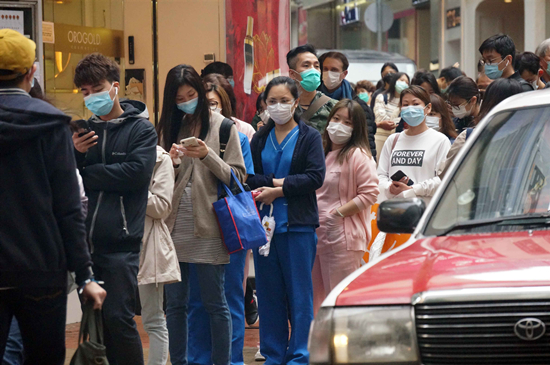 圖:香港市民排長隊買口罩。(中新社資料圖片)