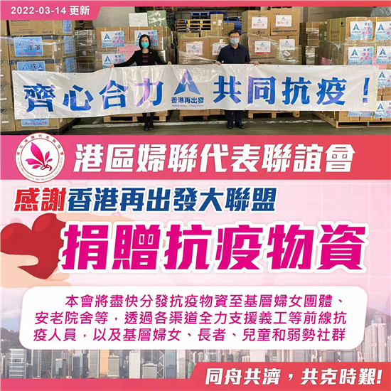 2022年3月14日,港區婦聯代表聯誼會會長、全國人大代表、全國婦聯執委、香港立法會議員陳曼琪律師代表接收由香港再出發大聯盟捐贈的12萬件防疫物資,包括有1萬個面罩、3萬個新型冠狀病毒(COVID-19)抗原檢測試劑盒及8萬個醫用外科口罩。香港再出發大聯盟副秘書長、全國政協委員、香港立法會議員黃英豪議員代表出席捐贈儀式。