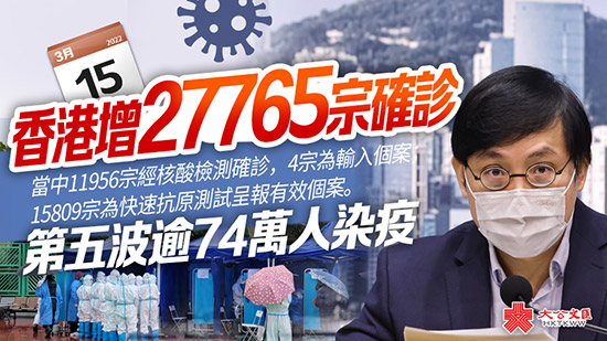 大公文匯全媒體報道,香港第五波疫情嚴峻,衞生署及醫管局今日(15日)下午舉行疫情記者會。衞生署衞生防護中心傳染病處首席醫生歐家榮公布,截至今日零時,香港新增27765宗確診個案,當中11956宗經核酸檢測確診,4宗為輸入個案;15809宗為快速抗原測試呈報有效個案。