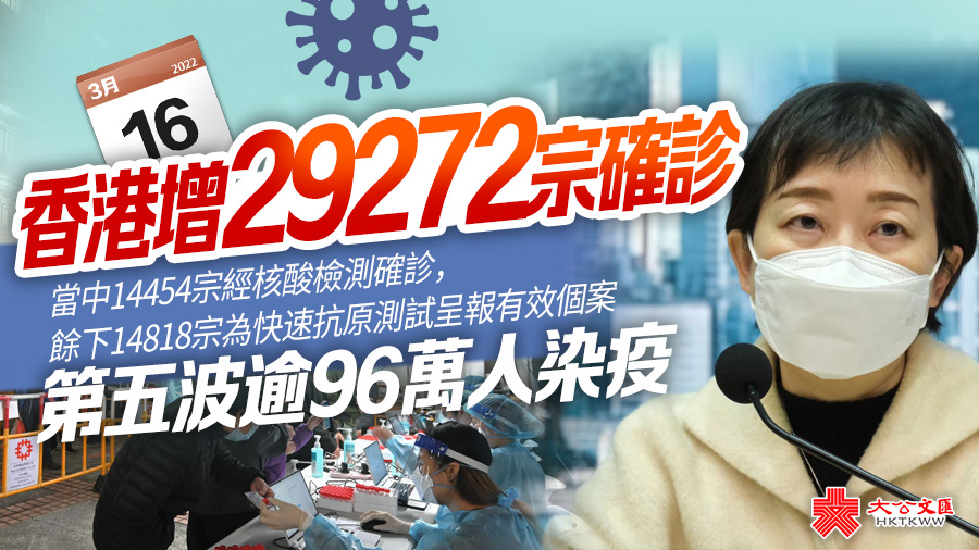 大公文匯全媒體報道,本港第五波疫情嚴峻,衞生署及醫管局今日(16日)下午舉行疫情記者會。衞生署衞生防護中心傳染病處主任張竹君公布,截至今日零時,本港新增29272宗確診個案,當中14454宗經核酸檢測確診,餘下14818宗為快速抗原測試呈報有效個案。本港第五波疫情纍計個案962581宗。