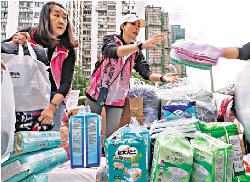 圖:李家超強調,獨立委員會會查清火災真相、追究到底。圖為關愛隊向災民派發物資。