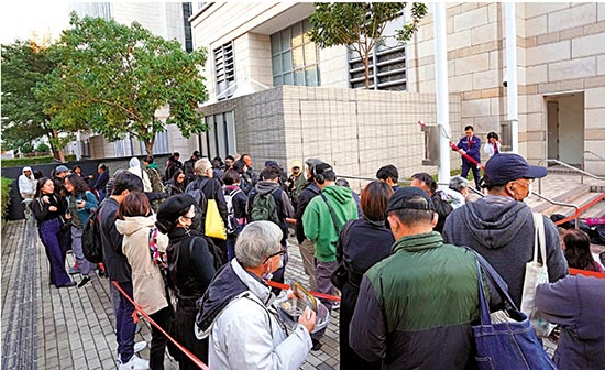 圖:香港的刑事案審訊一直以公開聆訊形式進行,過程完全透明。圖為傳媒和公眾日前輪候進入法院旁聽黎智英案裁決。\大公報記者林少權攝